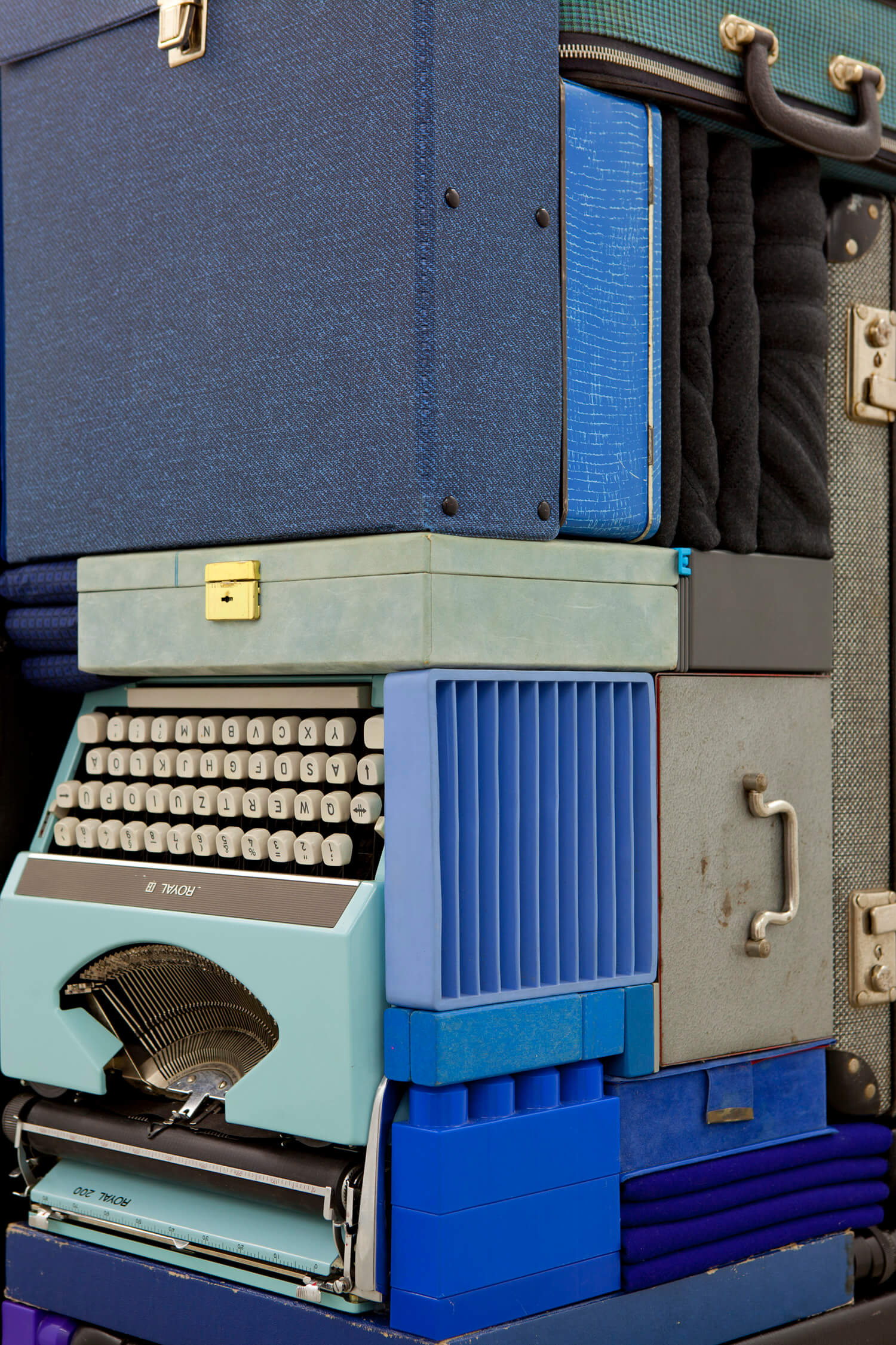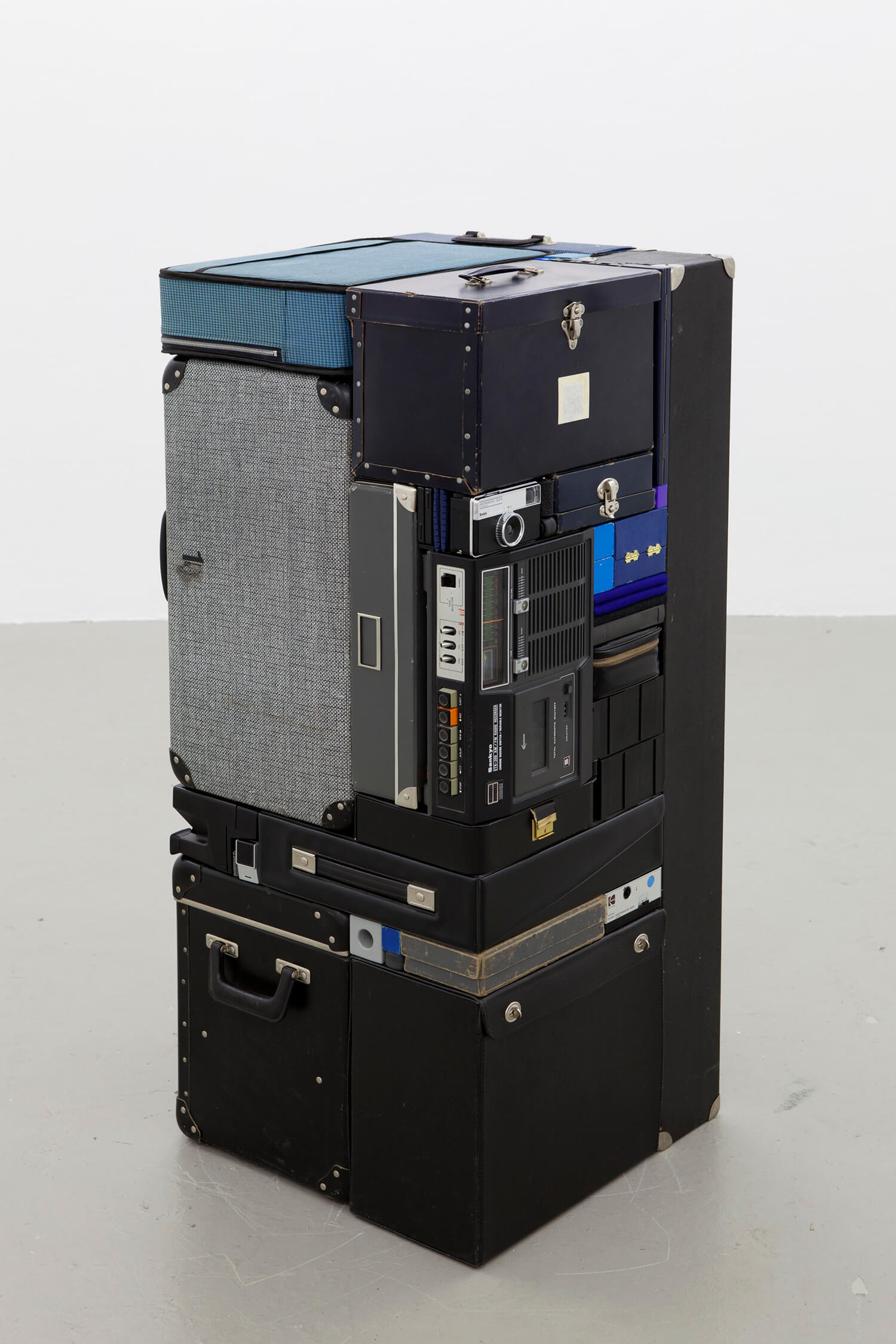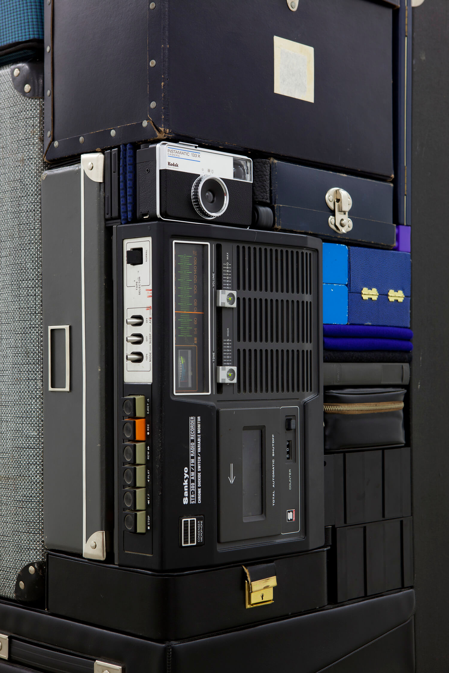 Black, grey and blue bags, boxes and ordinary items